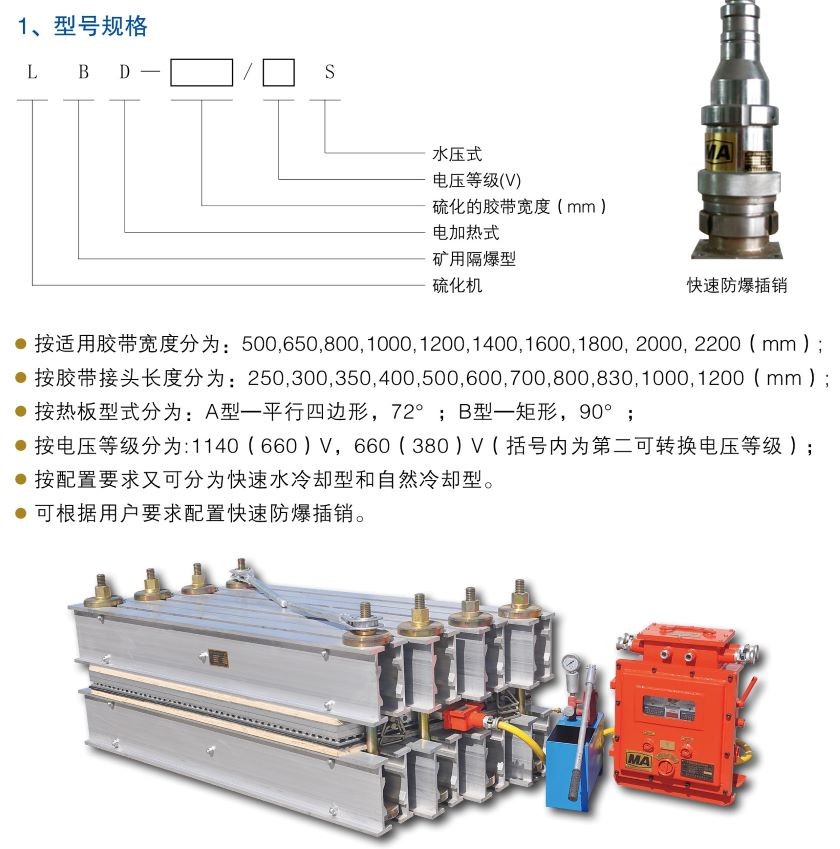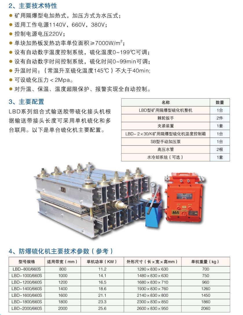 LBD系列礦用隔爆型硫化機(jī),是我公司與中國(guó)煤科院上海分院聯(lián)合研制的新式硫化機(jī),隔爆形式"EXdIMb"。配有高新全自動(dòng)隔爆電控箱,操作方便,工作可靠,搬運(yùn)輕松,適用于煤礦井下具有甲烷或煤塵爆炸危險(xiǎn)性混合物、工作環(huán)境相對(duì)潮濕、粉塵相對(duì)較大以及地段相對(duì)狹窄、傾斜的工作面??赏瓿筛鞣N輸送膠帶硫化接頭工作,是工作環(huán)境較差的硫化接頭理想設(shè)備。我公司所生產(chǎn)的所有規(guī)格的隔爆型硫化機(jī)均已取得國(guó)家礦用產(chǎn)品安全標(biāo)志證書。